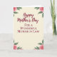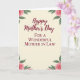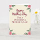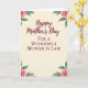 Designed with a soft, creamy vertical background, this card centers on a warm Mother’s Day message framed by gentle botanical corners ❤️. The main line, “Happy Mother’s Day,” sits in the middle in deep maroon flowing lettering, drawing the eye right away. Just beneath it, “FOR A WONDERFUL MOTHER IN LAW” appears in smaller, refined maroon serif text, aligned neatly under the first line. In each corner, watercolor-style floral clusters add a tender, affectionate touch, like a bouquet arranged with care for someone cherished. The flowers look like blush-pink roses with layered petals, paired with leafy greens that soften the edges and create a calm, intimate feel 🌼. The light parchment-like backdrop keeps everything airy and romantic, letting the maroon words and rosy tones stand close together without feeling crowded. Four delicate rose groupings sit at the top-left, top-right, bottom-left, and bottom-right corners, with green leaves curling inward toward the centered text.