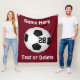 Maroon Soccer Throw Blanket PERSONALIZED with Your Team COLORS and Your 3 TEXT or Delete any or all text. Type in your NAME, Jersey NUMBER or MONOGRAM and Your TEAM NAME or Your Text or Delete it. Click the Customize Button if you would like to Change the Maroon and White Soccer Blanket background and or text colors to ANY COLORS. CALL Designer Linda to make the Changes for you: 239-949-9090