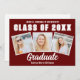 This modern maroon and white custom senior graduation announcement photo collage card features your high school or college portrait pictures for the class of 2025. Customize with your graduating year under the bold handwritten script and grad cap for a great personalized graduate announcement.