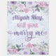 Elegant wedding proposal blanket has pink and lilac blush flowers with modern trendy script font that says "(Name) Will you marry me?"