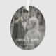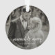Beautiful wedding day photograph christmas ornament with a simple, modern, minimalist "married and merry" quote in handwritten script typography. This versatile design can be personalized with your own photograph, name and date to make a truly unique and bespoke design in honor of your special day. The card shows an example image of a couple on their wedding day. The bridge is wearing an intricate boho wedding dress with lace and pearls and has long loose curly blond hair. The groom has a trimmed beard is wearing a dark three peice suit, bow tie and floral button hole. They are standing together lovingly with his hands around her waits, in a meadow with trees in the background. The vibe is romantic and wild. The image is beautifully shot in monochome sepia black and white. This images is designed as a placeholder to be replaced by your favorite photo or family picture.