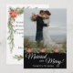 Christmas holiday photo card for newlyweds features your favorite wedding photo with "Married and Merry! in white script on top of a black background. Personalize with your names and the year beneath. On the reverse side is a sentiment for your friends and family who shared your wedding with you. It is surrounded by a lovely pine boughs, pinecones and poinsettias frame.