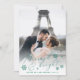 Elegant holiday photo cards for newlyweds feature a favorite vertical or portrait oriented wedding photo with "married & bright" overlaid in festive green calligraphy script adorned with snowflakes. Personalize with your names or custom greeting beneath. Perfect as a combination Christmas card and thank you card at your first married Christmas, you can add four additional photos to the back, along with a custom pre-printed message of thanks to your guests.