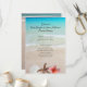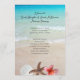 A keepsake beach wedding program for a casual and short ceremony by the sea. Flat 5x7 inch cards contain a beach scene, sand dollar, starfish and pink plumeria flower. Black text is easy to customize with names of the bride and groom at the top, date and location of the ceremony and a paragraph for ceremony information. Also include a message to guests if you wish. Notched corners are optional, with paper upgrades available.