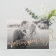 This modern and simple holiday/christmas wedding announcement card features the word 'Married and Merry' in a copper / rose gold faux foil trendy brush script calligraphy overlaying a full bleed photo. The back of the card has a matching faux foil background with white snow dots pattern.