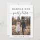 Modern elopement or smaller wedding announcement card to let family and friends know that your wedding plans changed, requiring you to elope or reduce the number of guests at your wedding to a small intimate group, but that you will host a celebration party in the future. The front features your photo and "Married Now, Party Later" in a mix of simple typography and trendy script. Under your photo you can add your first names and wedding date. On the reverse side you can personalize your message in more detail and your names in a signature script.
