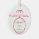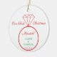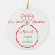 This item is perfect for couples who have been newly married and are celebrating Christmas for the first time as a married couple. The front features a wedding ring with customization for names and the wedding date. The back of the ornament has a red and white stripe pattern for extra holiday flair!