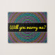 This puzzle design features an eyecatching pattern involving numerous circles/rings of various colors. It also features the marriage proposal "Will you marry me?" on the front in yellow script-like text. A puzzle like this could be a fun way to pop the question to somebody special.
