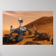 Artist concept of Mars Science Laboratory Curiosity rover, a mobile robot for investigating Mars' past or present ability to sustain microbial life. In this picture, the rover examines a rock on Mars with a set of tools at the end of the rover's arm, which extends about 7 feet. Two instruments on the arm can study rocks up close. Also, a drill can collect sample material from inside of rocks and a scoop can pick up samples of soil. The arm can sieve the samples and deliver fine powder to instruments inside the rover for thorough analysis.