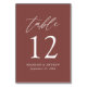 Elegant wedding table number card featuring a modern calligraphy script with the table number, your names, and wedding date displayed in white lettering on a marsala background. The marsala table number is perfect for late summer and fall weddings. Designed to coordinate with our Romantic Autumn Floral wedding collection.