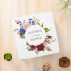 A lovely rustic bridal shower recipe binder featuring text in a white circle surrounded by a watercolor floral bouquet in marsala, navy blue and pink. The spine is marsala with white text.