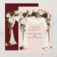 Design features a printed colored floral element in shades of marsala and blush pink overlaying a light pink kraft paper textures with white canopy top and calligraphy script or type writing. Great for your wedding celebrations!
