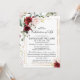 Funeral memorial invite featuring marsala roses, green leaves and gold frame.