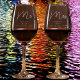 This elegant set of Mr. and Mrs. etched wine glasses makes a perfect wedding gift for the newlyweds. Included in the Marseille Bleu collection because the design continues the theme of a modern script font paired with a much simpler block style font, this time etched in glass rather than printed in a beautiful blue. Imagine the Bride and Groom at their reception, sitting at the head table with these elegant personalized wine glasses. Each wedding wine glass is personalized separately so you can add the Bride and Groom's first names, last names and the wedding date. Add a little custom touch to the wedding reception festivities with a gift of these unique Bride and Groom wedding glasses. This personalized glassware also makes a lovely and thoughtful gift for wedding anniversaries or a first Christmas or Hanukkah together.