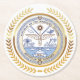 The national seal or coat of arms of the Marshall Islands, is set on a white background. The emblem is infused into a faux gold circle shape, and that, in turn, is nestled in the middle of a faux gold laurel wreath.