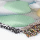 A quality printed throw has its advantages. This is a much finer weave throw than its loopier cousins, and though lighter, it is worth the investment for custom room accessorizing. The back is much prettier than the typical brown, and the fringe on the long sides very vivid, the selvage nicely done. Before photographing, I washed the throw in cold water, delicate, with a thicker woven throw the same size. On tumble dry low, this throw was dry in half the time as the other. This is a very practical quality if you use throws for furniture covers or to wrap up in frequently. The sleekness of the fabric makes it a great layer for accenting or protecting without the feeling of sitting on too much stuff. Perfect for napping or when you feel a light chill coming on. The color printing is beautiful and on this fabric, matched the design and color of my Photoshop image. This is an advantage for blending room fabrics and colors. The fringe on the short sides prints the colors from the design image and therefore varies from the side fringe. I streaked a white fractal line through the plaid pattern to give the illusion of weaving. This printed as crisp as an illusory thread, and put some white in the short side fringe, showing another advantage of print vs loomed- for artistic purposes, line lines, detail, and color integrity can be planned and preserved. My loomed throws have color limitations and more of a needlepoint texture. Print throws reproduce an exact image. The throw felt a little stiff straight out of the package, but this went away in the first delicate wash. Of course I searched the wash water for ink or bleeding and there was none.