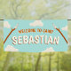 Welcome guests in style with this Marshmallows Blue Welcome Camping Birthday Party Banner! Featuring a charming 3D low poly design, the scene displays two sticks with marshmallows—one on each side—set against a cheerful blue sky with soft white clouds. The center showcases customizable text, perfect for personalizing with your own message, such as “Welcome to Camp Sebastian”.