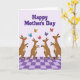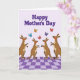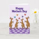 This greeting card features a sweet digital illustration of four upright, long-eared marsupial-like animals arranged evenly, two on each side, in warm brown with soft cream accents. Their gentle smiles, rosy cheeks, and slightly open forelimbs suggest they’re leaning into a shared, affectionate moment, like close friends gathering for a hug ❤️. Above them, several stylized butterflies flutter in orange, bright blue, deep red, and soft purple, adding a light, romantic lift to the scene. The background fades from light lavender at the top into a purple checkered floor below, mixing lighter and deeper squares for a cozy stage-like setting. Across the upper area, the words “Happy Mother’s Day” appear in rounded, thick letters colored a rich purple, standing out clearly against the pale backdrop 🌼. Soft, even lighting keeps everything smooth and gentle, with no sharp shadows competing for attention. The four characters’ long ears angle slightly outward, and the butterflies are scattered in a loose arc above their heads.
