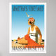 A retro poster that never was until now. A redo of an old poster that should have been. Martha's Vineyard on the Beach in retro style from the art deco era. Bright colors with a woman on the beach under a blue sky.