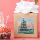 This antique image shows an elegant ship at full sail leaving the harbor. The colorful sky of blue and orange is a soothing compliment to the blue green water. It is ready for your personalization.