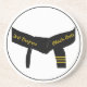 The sandstone Martial Arts Third Degree Black Belt Beverage Coaster is perfect to protect your furniture from your drippy drink glasses and frosty mugs. Feel free to customize it as you wish to suit your personal needs. This unique custom martial arts drink coaster features a digitally enhanced photograph of a 3rd degree, or 3rd dan, martial arts black belt with three gold stripes or bars. This customizable black belt coaster is suitable for an athlete practicing karate, taekwondo, kung fu, judo or ju jitsu.