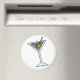 A brightly colored martini glass filled with a wavy rainbow of cocktail fun and garnished with the classic cocktail olive on a martini pick. Perfect for any party or happy hour celebration.