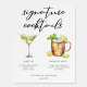 This chic signature cocktails foam board sign features simple black typography above 2 drinks and their ingredients for your wedding bar. A cute Martini and Moscow mule drawing add a cool flair to your bar menu. Complete with the couple's names and date for their reception.