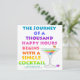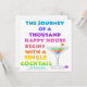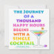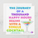 "The journey of a thousand happy hours begins with a single cocktail." ~ The Martini Diva Illustrated with a rainbow martini and four colorful olives.