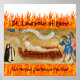 “Turn me over,” he said to his executioners. “I’m done on this side!” Known especially for his droll sense of humor, St. Lawrence of Rome (third century) is one of the Eternal City’s most celebrated martyrs. We like to think he would be amused by our coordinating “Grilling (or Cooking) with” products! + In this splendid painting of c. 1430 by Venetian artist Jacobello del Fiore, St. Lawrence is depicted being roasted to death. The disparity in the sizes of the main figures is a feature of art that does not employ perspective. The larger the figure, the more important the person portrayed in the composition, God the Father being an exception here. St. Lawrence, lying prone on the gridiron, dominates this scene. Raising his upper torso on his elbows and with hands folded in prayer, the Saint gazes heavenward to God with a serene expression on his face. As was the custom in pre-Renaissance art, God the Father is not represented as a full human figure, but only as a head emerging from the clouds in the top left corner of the picture where only the Hand of God would have appeared symbolically in ages prior. On the right of the panel, St. Lawrence’s executioners, next in relative size and importance to him, tend the fire beneath the gridiron with long-handled rakes, the one in front shielding his face from the heat of the flames. On the left, there are two kneeling nuns, nuns who either commissioned the panel themselves as an object of private devotion or commissioned the panel on behalf of their convent as part of a larger artwork like a predella. They are the smallest figures of all. The subsidiary elements include two scrolls with Latin inscriptions— one in the space above the St. Lawrence and one arching around the nuns. + St. Lawrence is patron saint of comedians and of cooks. + Feast: August 10 + Image Credit (M 022): Martyrdom of Saint Lawrence, with Two Nuns, by Jacobello del Fiore (Venetian Italian; 1370-1439), tempera painting on wood panel in the International Gothic style, 27.7”x14.9” (70.5 cm x 38 cm), Rijksmuseum, Amsterdam, The Netherlands, Acc. No. SK-A-4001. The nuns have been variously identified as Dominicans or Benedictines. From Wikimedia Commons {{PD-Art|PD-old-100}}. The image file has been identified as being free of known restrictions under copyright law, including all related and neighboring rights. + Image Credit (Flame Border): Extension/Adaptation of Fire Border Clip Art (Digital Flames of Fire) by Diane Hudson, PublicDomainPictures.net, CC0 1.0 Universal (CC0 1.0) Public Domain Dedication.