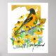 A poster print decorated with a vibrant Baltimore Oriole bird perched in a blooming patch of Black-eyed Susans over the state shape in golden yellow shades hand illustrated with sepia ink and watercolor. Inspired by the state bird and state flower of Maryland. Great for college dorm room decor or anyone who loves "The Old Line State"