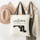 Welcome guests to your Maryland wedding with these chic and modern personalized tote bags. Design features "welcome" in modern handwritten calligraphy script, with your initials joined by a heart, along with your wedding date, inside a black silhouette map of the state of Maryland. Personalize with a specific Maryland city or location name if desired.