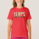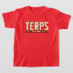 The design prominently features the word "TERPS" rendered in a stylized, sans-serif, block-letter font. The letters are filled in red and outlined in yellow, creating a distinct contrast. Below the wordmark is a horizontal rectangular banner. This banner displays a stylized representation of the Maryland state flag, incorporating a combination of black and yellow geometric patterns along with the red and white Calvert and Crossland crest elements. The overall design is graphic, clean, and utilizes the official colors of the University of Maryland.