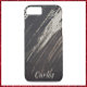 Elegant and modern phone case with a masculine vibe. Abstract brush strokes of paint in black and brown on a wood background. Personalize with your name.