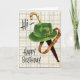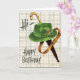This would be a nice birthday card for someone. It would be nice for a guy especially. A man's hat is shown with a feather and an umbrella. It is a vintage card of times gone by.