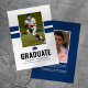 Modern boy graduation announcement card featuring 2 navy blue sport stripes, 2 photos of the graduate (one either sided), a motarboard, and a text template that is easy to personalize.