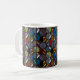 This mug has a mid-century modern design of oval halves, some solid and some striped, in masculine colors on a field of dark gray.