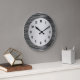 Masculine wall decor clock with modern simulated metal background designed to look like there are holes in the metallic surface with numbers that stand out on the clock face. Designed for a guys room, office wall in an automotive business, or kitchen clock in a ultra modern kitchen decor environment.