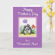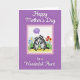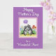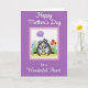 This card features a rich purple background with a centered picture window outlined by soft pink and white borders. Inside the frame, two small masked woodland animals with striped tails stand close, facing each other with their noses nearly touching, suggesting a sweet bond like close friends or family ❤️. The larger figure leans in gently toward the smaller one, and their inward-tilted poses make the moment feel private and caring. A pale lavender speech bubble floats above them, adding a quiet, affectionate touch without needing words. Along the bottom, sandy-colored ground is sprinkled with tiny red and yellow dots, while tufts of green grass break up the space. On the left sit yellow and blue daisy-like flowers, and on the right there are clustered red and orange blossoms with a sunny feel 🌼. White curved lettering sits above the framed scene reading “Happy Mother’s Day,” and matching white curved lettering below reads “to a Wonderful Aunt,” with both lines arcing neatly around the picture window.