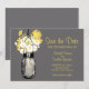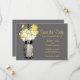 Perfect for a country style wedding or maybe you just love Mason Jars! Mason Jar hanging on a hook filled with country wildflowers. A Cool Charcoal Gray background against the hanging Mason Jar and wildflowers in colors of yellows and white daisies. If you have any questions on this design or want a color change please email me paula@labellarue.com Also check for the RSVP, RECEPTION and GUEST SEATING Cards to match!