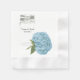 Pretty cottage chic looking wedding napkins done in white, with graphic artwork of a large aqua blue hydrangea, in front of a mason jar. Personalize the black text for your wedding party.