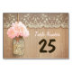 rustic country wedding table cards with pink hydrangea, mason jar and ivory lace