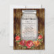 Bridal shower design with Mason jar and wreath shaped array of colorful roses and flowers, on a dark brown vintage wood plank background image. A rustic summer outdoor theme for a country or cabin theme bridal shower. Rich dark brown wooden boards from an antique fence or floorboards contrast against beautiful pretty floral graphic. © CustomInvitesOnline.com