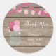 Round sticker for baby shower favor with mason jar flowers design and wood background.