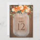 These larger sized table number cards are perfect for your boho country wedding. The design features a bouquet of watercolor orange flowers decorated with string lights with a background of rustic brown wood.