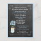 Popular chic, vintage chalkboard look, Baby shower invitation in blue. Rustic country mason jar filled with pretty blue flowers, blue and chalkboard look background print and text. Baby shower invitation is personalized. Add matching products. Please visit my store "The Hungarican Princess" at www.zazzle.com/hungaricanprincess*. Look in my "Oh Baby" department category. Congratulations! The "blue color" hex # is BFE4FF.