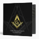 Looking for great freemason lodge gift ideas? These personalized masonic binders can be customized for individuals or for a lodge in general for use in meetings, notes, records and more. Surprise your masonic lodge officers at the Annual Installation of Officers with a gift that can definitely be put to use! The front cover of this custom masonic binder features a unique, modern square and compass symbol, available in different finishes of silver, white and more (these special options can be seen from your desktop computer). As an additional option for these personalized masonic office supplies, add your own personalized text to the spine of these template binders, or delete to leave blank. If you would like further customization, change the color, font size and more. Category: freemasonry; freemason binders; and masonic gift ideas. Colors: black and gold (with options of navy blue and other colors).