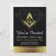 Category: personalized invitations and cards for freemasons. Color theme: metallic gold, black and white.