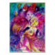 Colorful Venetian nocturne with an expressive ,romantic character : whimsical violin player with feathered sparkling pink fuchsia costumes and a funny owl in the moon light ,with a magic butterfly plant inside of the card .Watercolor painting in bright red green,blue,yellow colors , gold sparkles ,inspired from Piero (Pierrot ),Comedy of Art (Commedia dell'arte ) and Carnival of Venice .