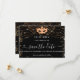 A girly and trendy Save the Date card for a 50th (or any age) birthday masquerade party. A classic black background decorated with faux gold glitter dust and a masquerade mask. Personalize and add a date and name/age. The text: Save the Date is written with a large trendy hand lettered style script.