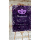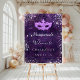 A welcome board for a girly and glamorous Sweet 16, 16th birthday party. A deep purple floral lace pattern as background. Decorated with faux silver glitter dust and a masquerade mask. Personalize and add a name.